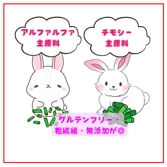 成長期(~1歳)はアルファルファ主原料、成長後はチモシーが主原料のものに切り替えましょう。
