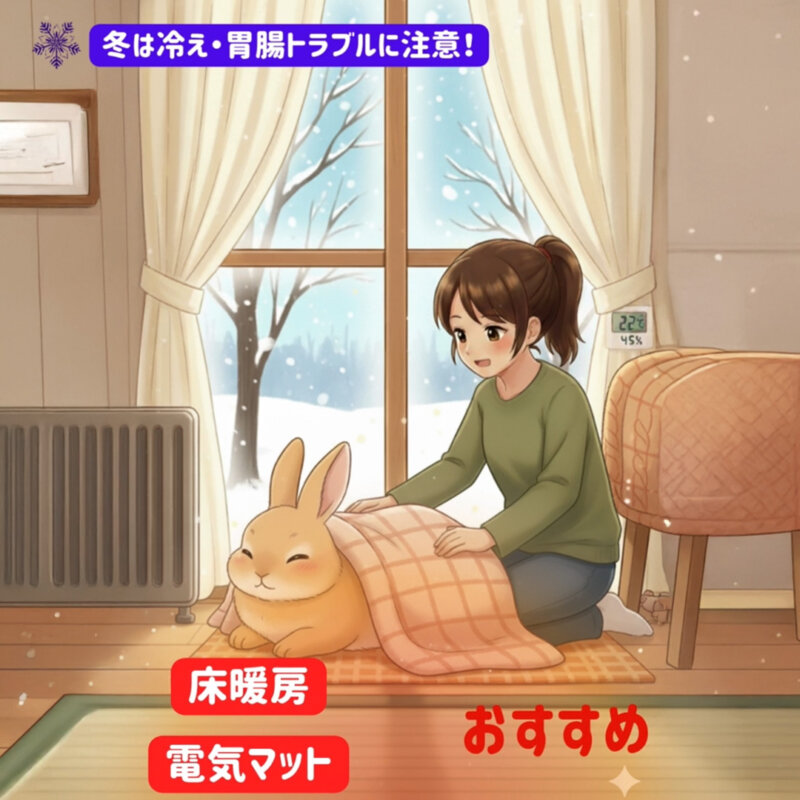うさぎさんはお腹を床につけてくつろぐので、冷やさない工夫が大切。