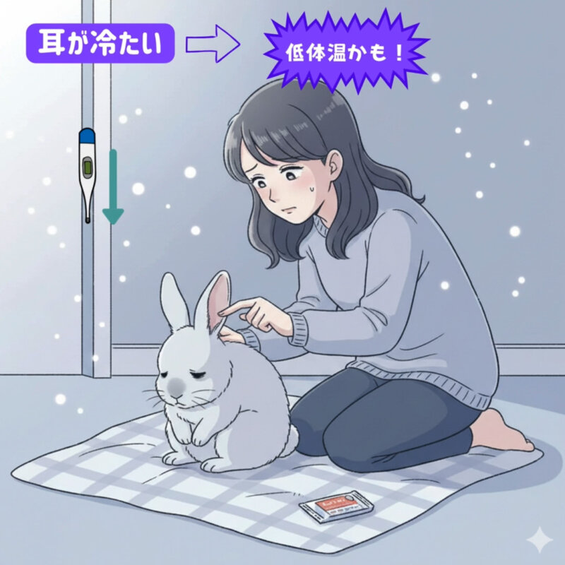 うさぎは病気で体調を崩すと体温が下がり、耳も冷たくなります。
